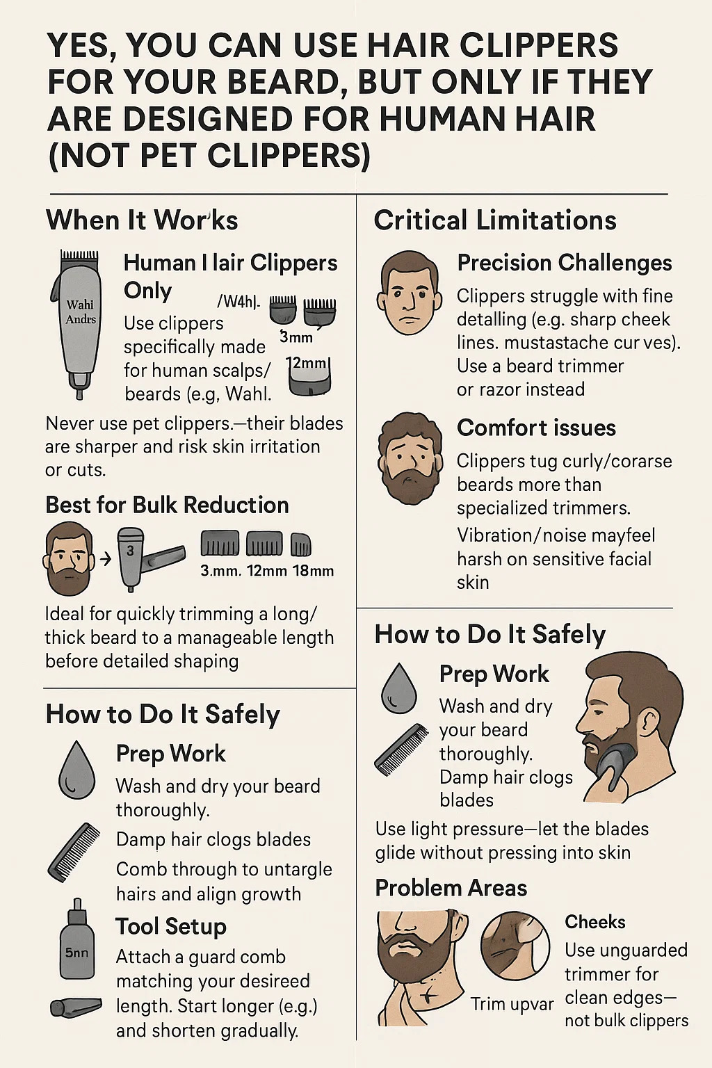 A klipperek küzdenek a finom részletezéssel (pl. éles arcvonalak, bajuszgörbék). Használjon helyette szakállvágót vagy borotvát.