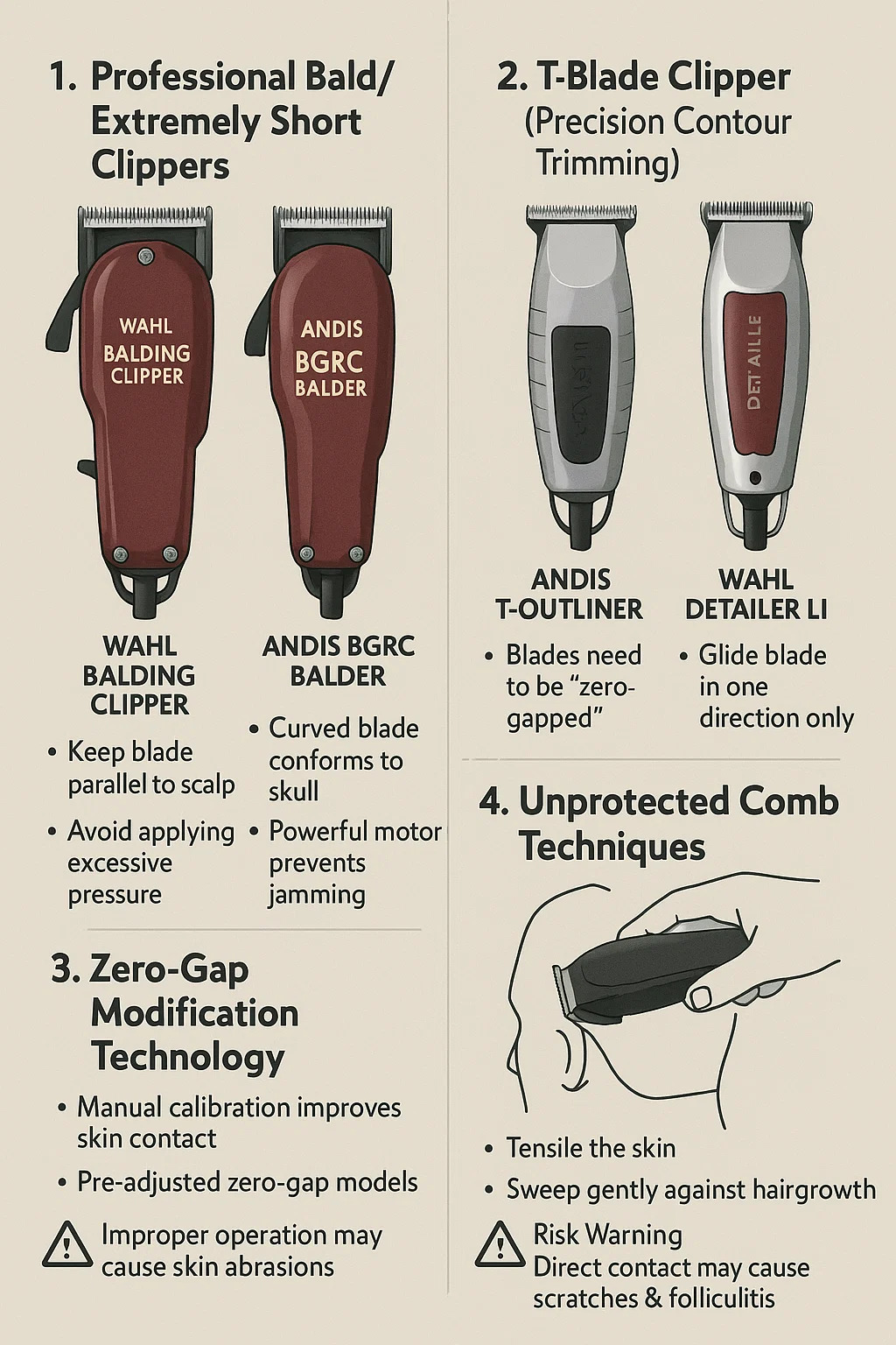 A végső, fejbőrhöz közeli hajvágáshoz a következő típusú hajvágók és technikákkal a borotvához legközelebb eső vágást lehet elérni, amihez a szerszám jellemzőinek és a kezelési készségeknek a kombinációja szükséges: